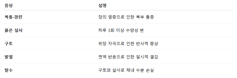 - 증상: 묽은 설사, 구토, 발열, 탈수