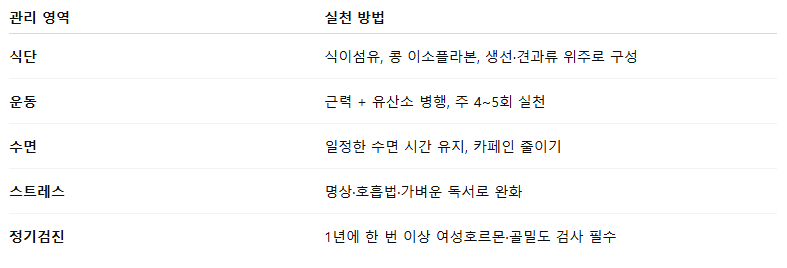 필요 시 여성 전문의 상담을 통한 호르몬 대체요법(HRT) 도 고려해보세요.
